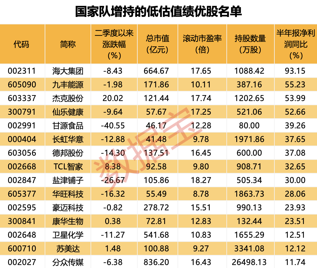 与一季度末的持股数据相比,二季度末,国家队持股数量呈现增长的有35股,15股的持股比例环比增超1个百分点。