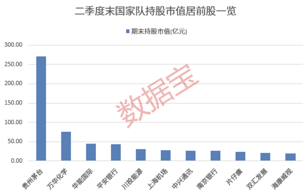 按照二季度末国家队合计持仓市值来看,持仓市值最高的前五名是贵州茅台、万华化学、华能国际、平安银行和川投能源,持股市值均超过30亿元。贵州茅台获国家队合计持仓270.54亿元,排在首位。