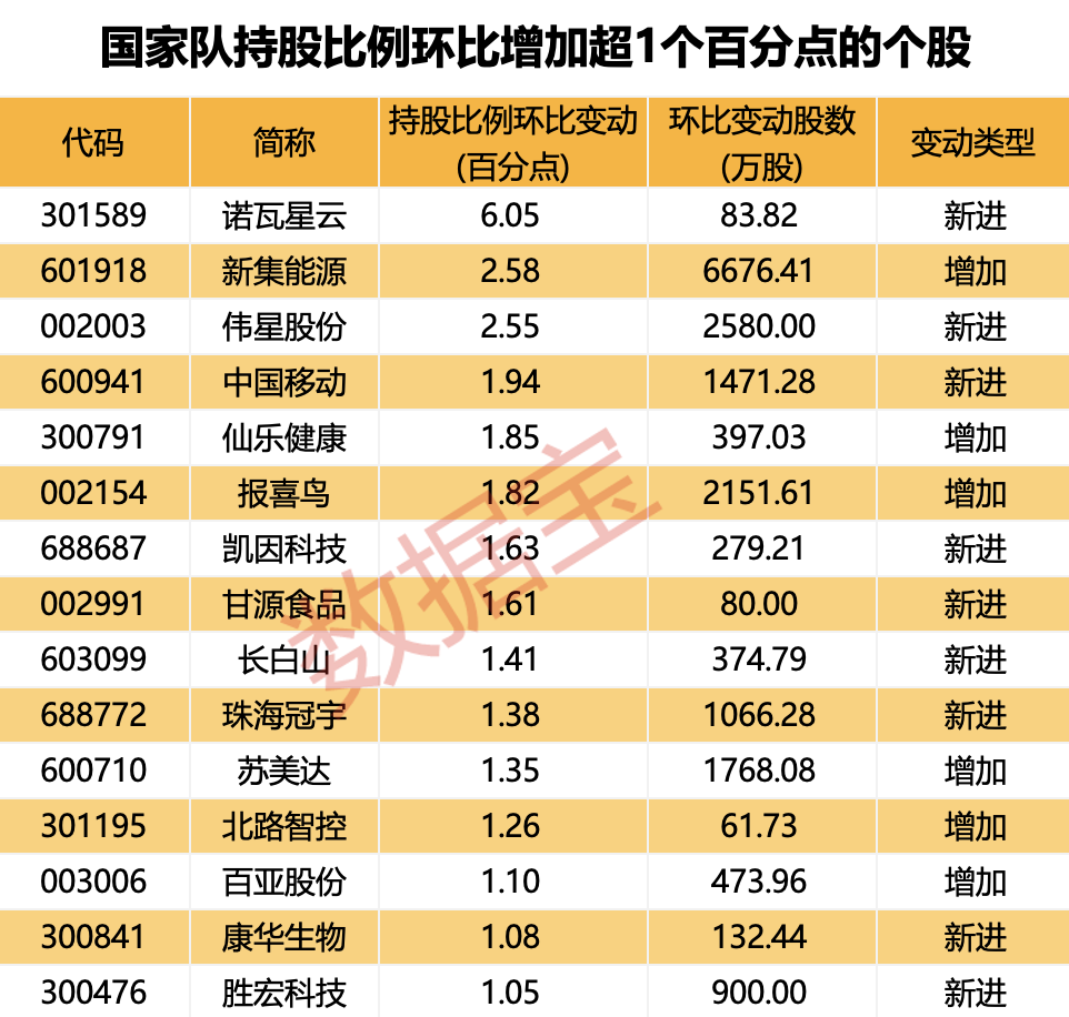 具体来看,新集能源、分众传媒、报喜鸟、苏美达均获得国家队增持超千万股;其中新集能源的增持股数量最多,增长6676.41万股,持股比例与一季度末相比增加2.58个百分点。