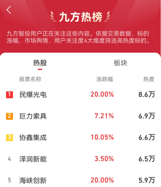 九方热榜:民爆光电,巨力索具,协鑫集成,浙文互联,泽润新能,海峡创新