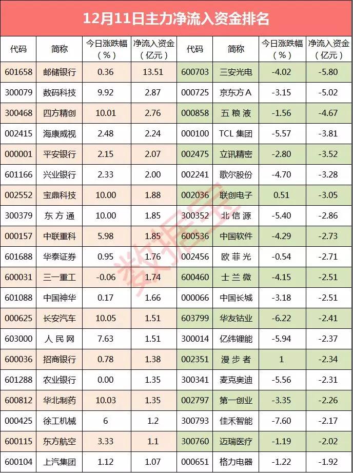 个股来看,共有22只个股主力资金净流入超亿元,邮储银行主力资金净流入13.51亿元,净流入资金居首;数码科技、四方精创紧随其后,全天净流入资金分别为2.87亿元、2.76亿元;全天净流入资金较多的还有海康威视、平安银行等。股价表现方面,净流入资金超亿元个股今日平均上涨4.28%,表现强于大盘,涨停的有长安汽车、华北制药、四方精创等。跌幅较大的个股有三一重工等,跌幅分别为0.06%。