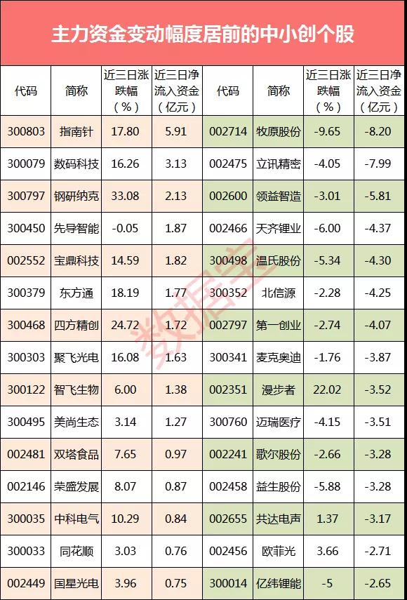 从近三个交易日数据来看,主力资金大幅流出中小创个股,净流出金额为247.94亿元。11股却获主力抢筹超亿元,其中近三个交易日主力资金净流入居前的个股是指南针、数码科技、钢研纳克,分别净流入5.91亿元、3.13亿元、2.13亿元;净流出最多的个股为牧原股份、立讯精密、领益智造,分别净流出8.20亿元、7.99亿元、5.81亿元。