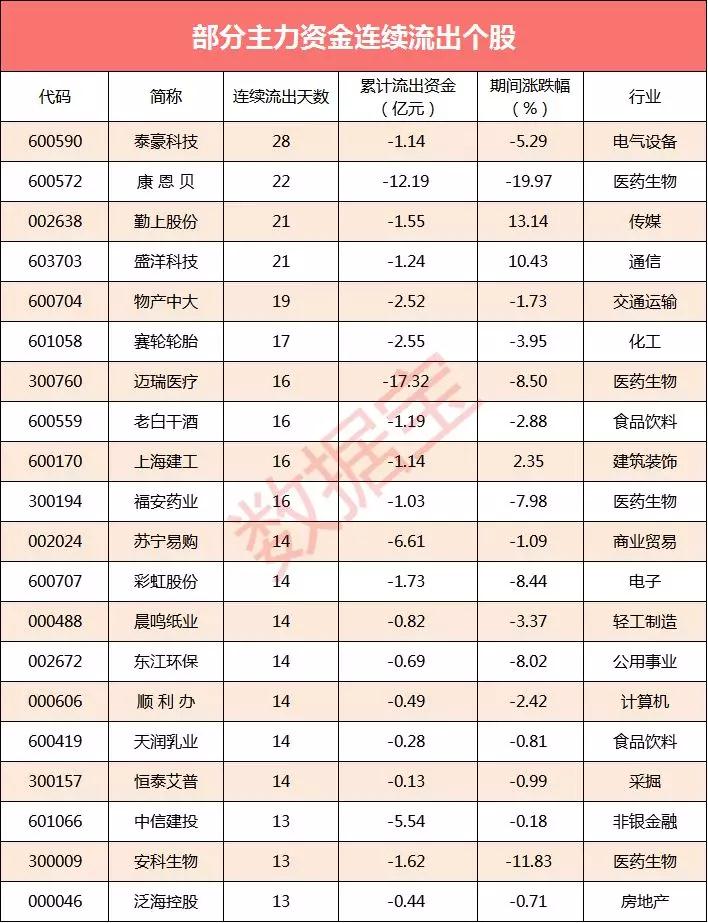 主力资金连续流出个股中,连续流出天数最多的是泰豪科技,该股已连续28个交易日净流出;连续净流出天数较多的还有康恩贝、盛洋科技等,主力资金分别连续流出22天、21天。从连续流出期间资金净流出金额来看,主力资金净流出金额最多的是中国平安,资金累计净流出18.11亿元,主力资金净流出资金居前的还有迈瑞医疗、万科A、创力集团等。