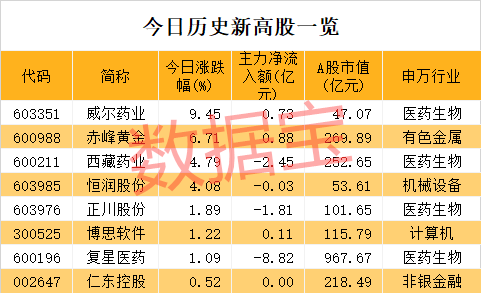 在两市大面积调整的时点,哪些股票悄然走强?证券时报·数据宝统计显示,剔除近一个月上市的次新股,今日收盘价创历史新高股仅剩8只,分别是威尔药业、赤峰黄金、西藏药业、恒润股份、正川股份、博思软件、复星医药、仁东控股,这其中有一半是医药股,这与当前疫情的发展不无关系。