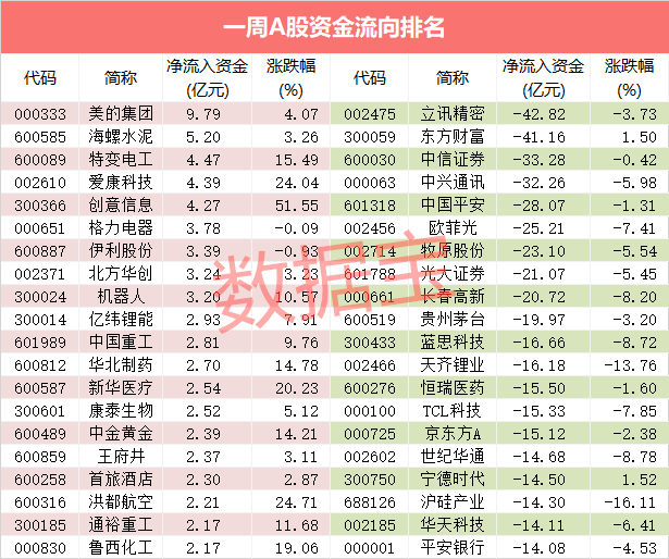 除上述科技龙头外,金融股中信证券、中国平安、光大证券,以及白酒股贵州茅台、猪肉股牧原股份、锂电池概念股天齐锂业、特斯拉概念股宁德时代等也是资金抛售主要对象。主力资金近五日逆市加仓哪些股?数据显示,美的集团、海螺水泥、特变电工、爱康科技、创意信息等本周获主力资金净流入超5亿元。美的集团主力资金净流入9.79亿元居首,该股本周累计上涨4.07%。昨日盘中美的集团创下历史高点,今日该股回调5.26%。