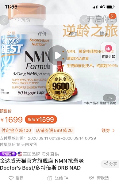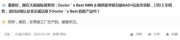 公司表示,美国子公司Doctors Best(简称DRB)于2020年7月8日在其天猫官方旗舰店上架试销售β-烟酰胺单核苷酸产品(简称“NMN”),该产品由美国工厂小批量生产,目前美国工厂小批量生产的产品已经全部销售完毕,共销售1406瓶,销售金额228.02万元。同时DRB在2020年7月16日在天猫官方旗舰店开放该产品接受预定,截至7月19日,共预售3605瓶,预售金额540.4万元。