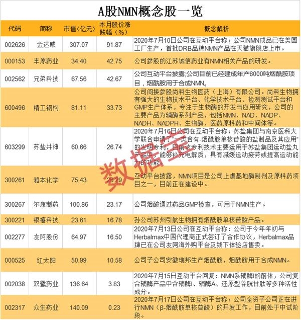 证券时报·数据宝统计,当前A股NMN概念股共有12只。除了金达威外,兄弟科技和丰原药业本月股价涨幅均超过了40%。兄弟科技在互动平台表示,公司目前已经建成年产8000吨烟酰胺项目,烟酰胺用于合成NMN。丰原药业上周在互动平台表示公司参股的诚信药业目前有相关产品的研发,没有该长寿药产品销售,目前对本公司的业绩没有影响。