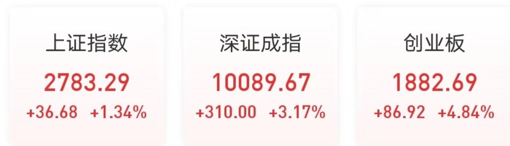 从今天市场的情况来看,A股三大股指全线反弹,创业板指大幅领涨。截至收盘,上证指数报2783.29点,上涨1.34%;深证成指报10089.67点,上涨3.17%;创业板指报1882.69点,上涨4.84%。