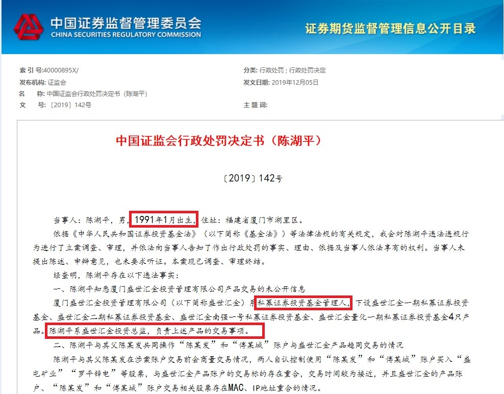 厦门盛世汇金投资管理有限公司是一家私募证券投资基金管理人,下设盛世汇金一期私募证券投资基金、盛世汇金二期私募证券投资基金、盛世汇金南强一号私募证券投资基金、盛世汇金量化一期私募证券投资基金4只产品。“案发主角”陈湖平则是盛世汇金投资总监,负责上述产品的交易事项。