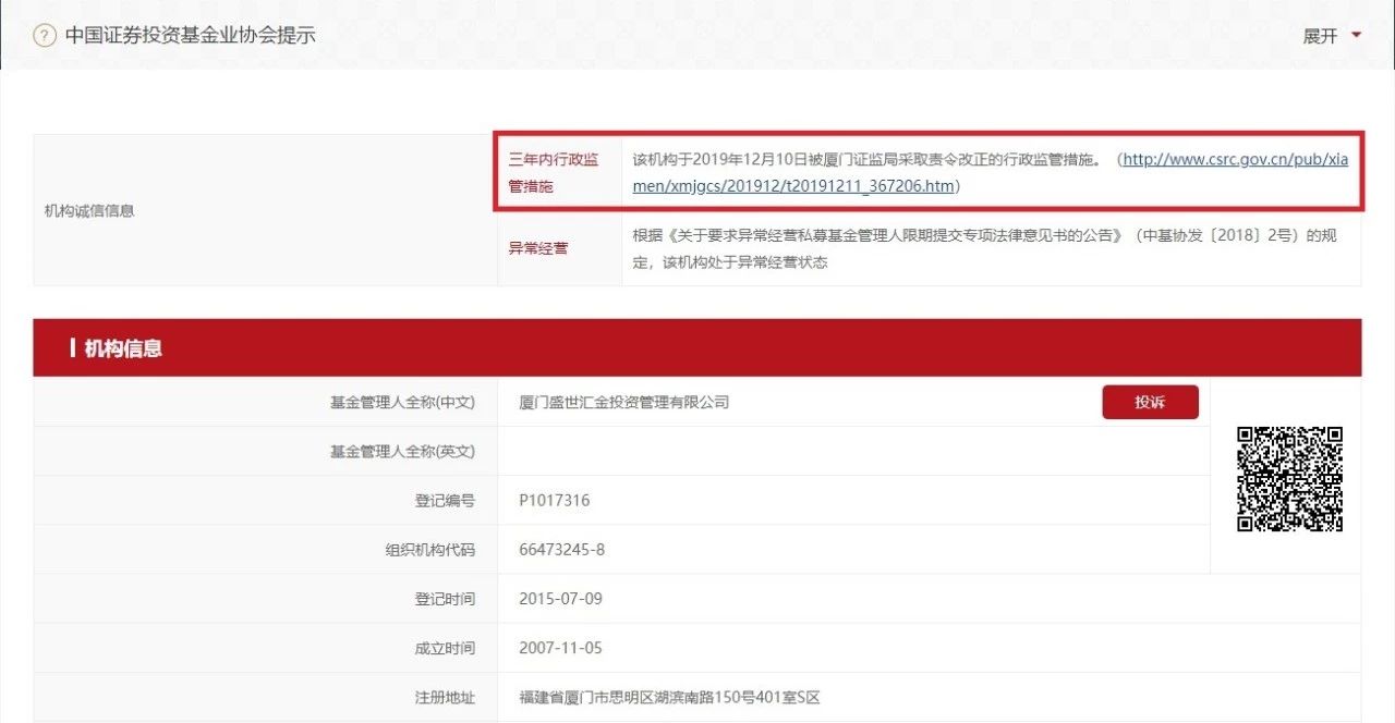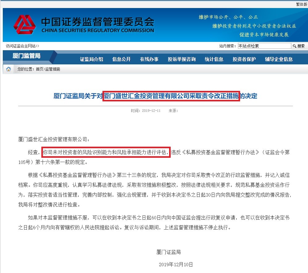 2019年12月10日,厦门证监局经查,发现厦门盛世汇金投资管理有限公司未对投资者的风险识别能力和风险承担能力进行评估,违反《私募投资基金监督管理暂行办法》(证监会令第105号)第十六条第一款的规定,对厦门盛世汇金投资管理有限公司出具了采取责令改正措施的决定。
