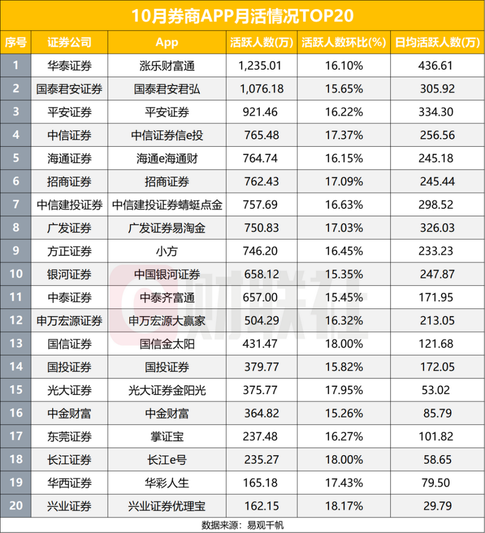 行情来了!10月券商APP月活TOP20出炉