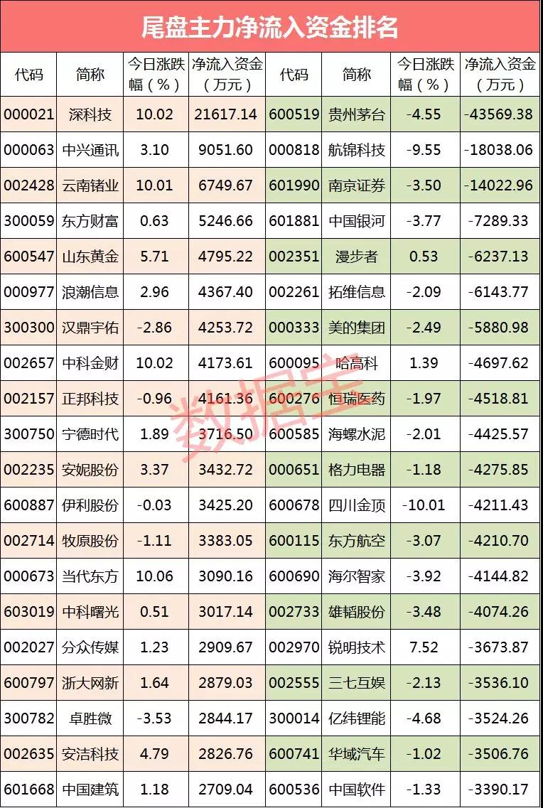 个股方面,尾盘仅有深科技资金流入超亿元,流入金额2.16亿元,该股尾盘站上涨停。另外还有3股资金流入金额超5000万元,包括中兴通讯、云南锗业、东方财富。尾盘有3股资金流出超亿元,包括贵州茅台、航锦科技、南京证券,尾盘资金流出4.3亿元,1.8亿元和1.4亿元。