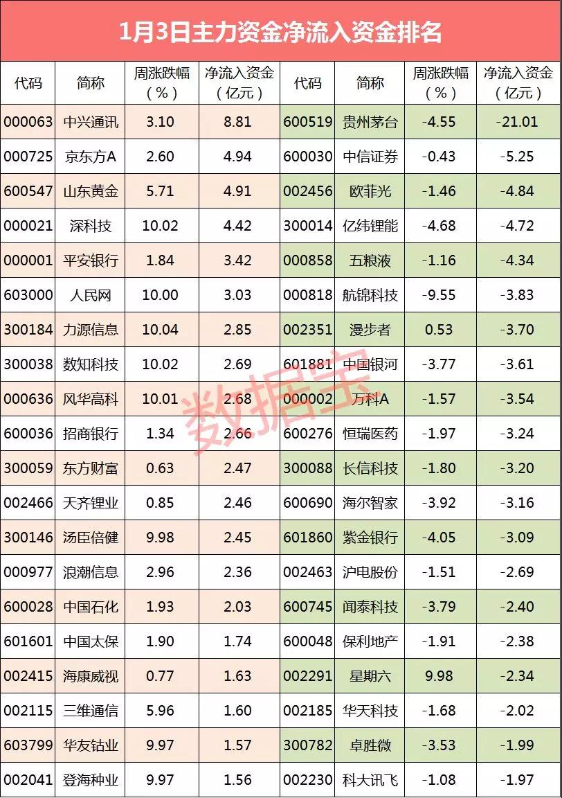两市有68只个股主力资金流出超亿元。其中贵州茅台主力资金净流出依然居榜首,净流出21.01亿元,由于第四季度业绩下滑,茅台近两日股价大跌超9%,两天蒸发市值达到1334亿元,两日合计资金流出48亿元。