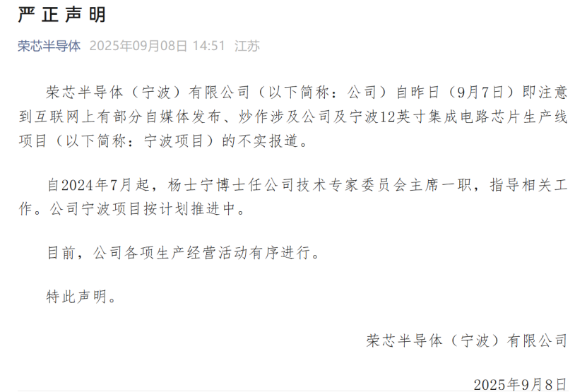 对于近日市场流传的公司宁波12英寸项目被曝暂停的消息,9月8日,荣芯半导体有限公司(下称:“荣芯半导体”)发布声明回应称,注意到互联网上有部分自媒体发布、炒作涉及公司及宁波12英寸集成电路芯片生产线项目的不实报道。