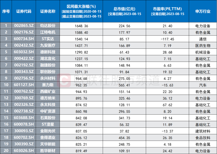 注:近3年中除期间上市的最大涨幅居前的个股(截至2023年8月15日收盘)