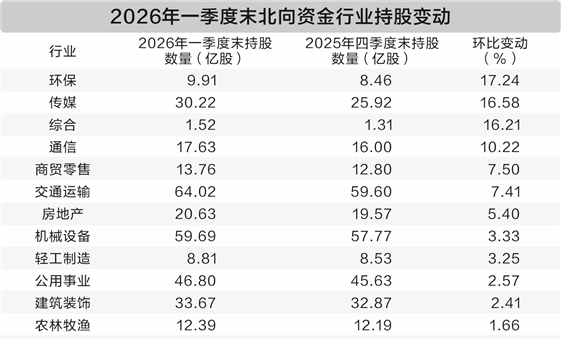 以传媒行业为例,截至2026年一季度末,北向资金持股数量合计30.22亿股,环比加仓16.58%。2025年,申万传媒行业指数涨幅27.17%,今年一季度该行业指数下跌近5%。财信证券表示,伴随模型能力持续迭代、AI应用场景加速落地、内容产业数字化升级不断推进,行业竞争格局逐步优化。