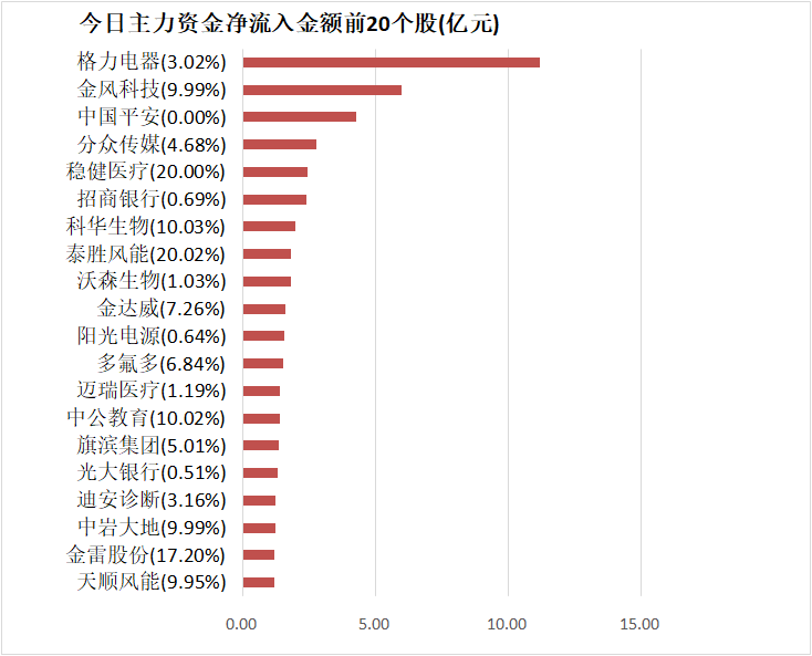 5、格力电器主力资金净流入11.18亿元居首