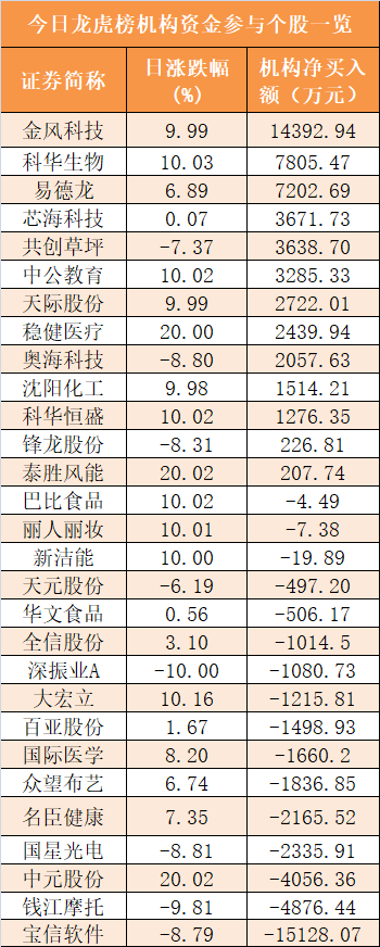 盘后龙虎榜数据显示,机构现身29股,其中金风科技等13股呈现机构资金净买入,宝信软件等16股呈现机构资金净卖出。