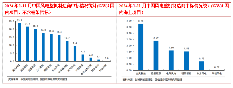 2024年1-11月中国风电整机制造商中标情况统计(GW)(国内项目,不含框架招标) 2024年1-11月中国风电整机制造商中标情况统计(GW)(国内海上项目)