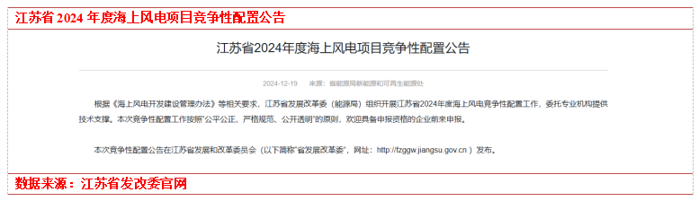 事件:江苏省发改委12月19日公布,组织开展江苏省2024年度海上风电竞争性配置工作。