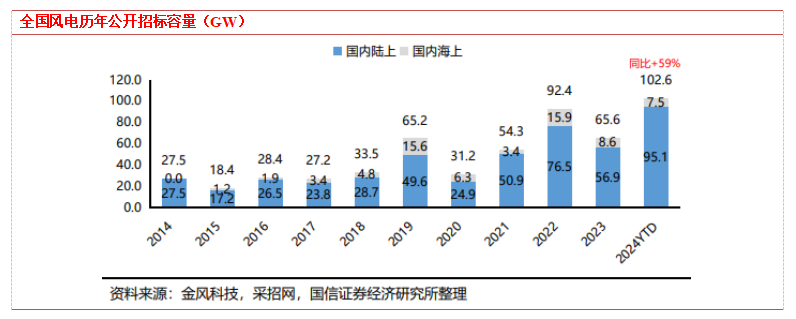 2024年至今,全国风机累计公开招标容量102.6GW(+59%),其中陆上风机公开招标容量95.1GW(+69%),海上风机公开招标容量7.5GW(-10%)。2024年陆上风机(不含塔筒)平均中标价格为1339元/kW。