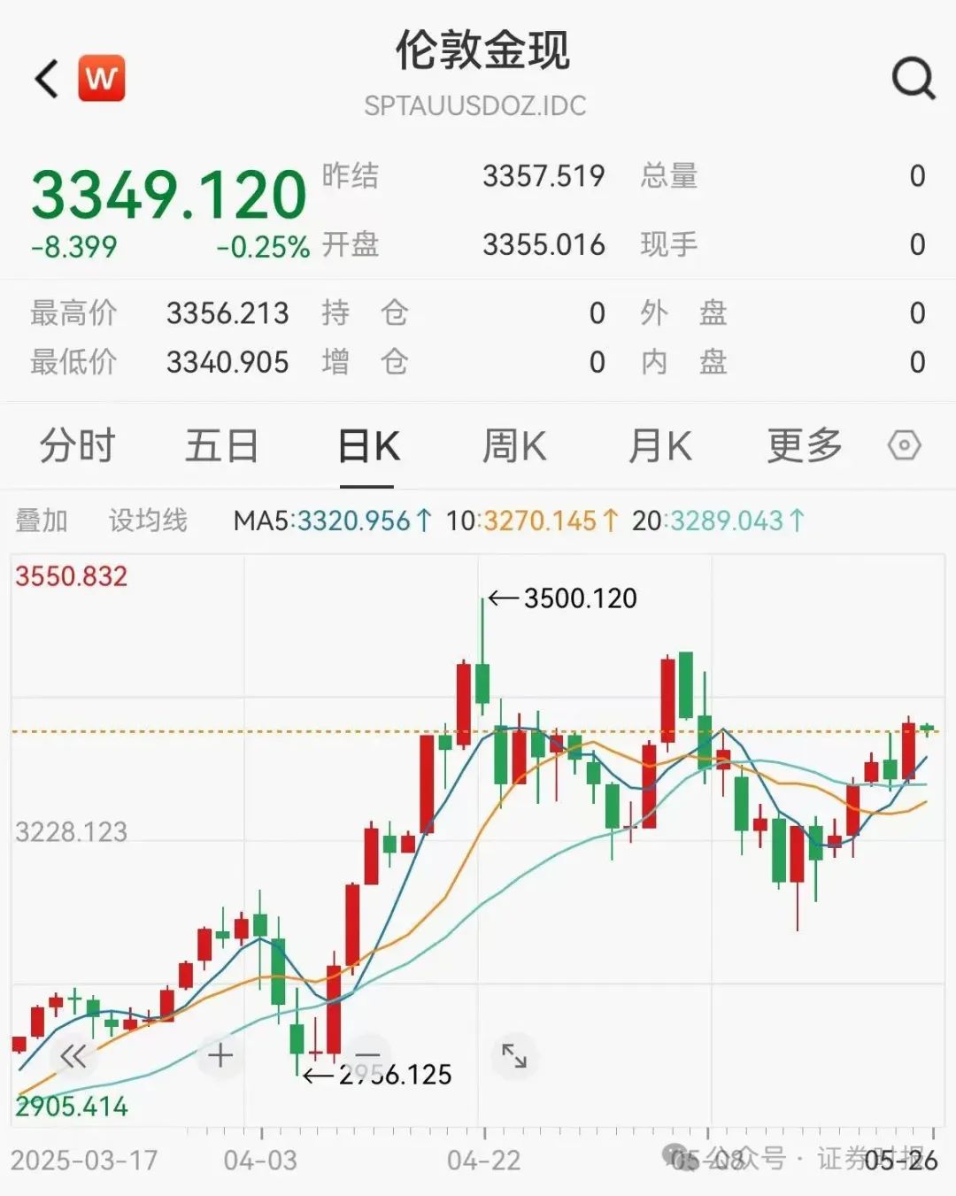 黄金则小幅走低,上周五(5月23日),伦敦金现盘中大幅拉涨,截至收盘涨超1.9%,报3357.519美元/盎司。