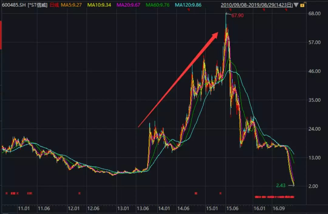 其实借壳上市也不算啥,最牛的是借壳不到两年,公司股价就在2015年6月达到历史高点67.90元,总市值逼近2000亿,在此期间股价翻了6倍之多。