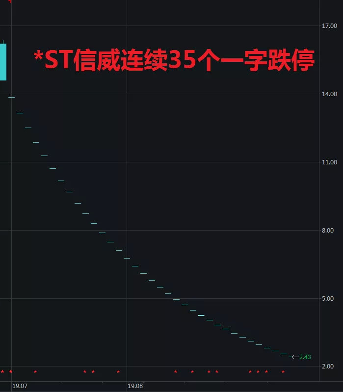 8月29日,*ST信威迎来第35个连续一字跌停,报收2.43元,总市值约71亿元,相较停牌前的427亿元,已跌去82.47%。