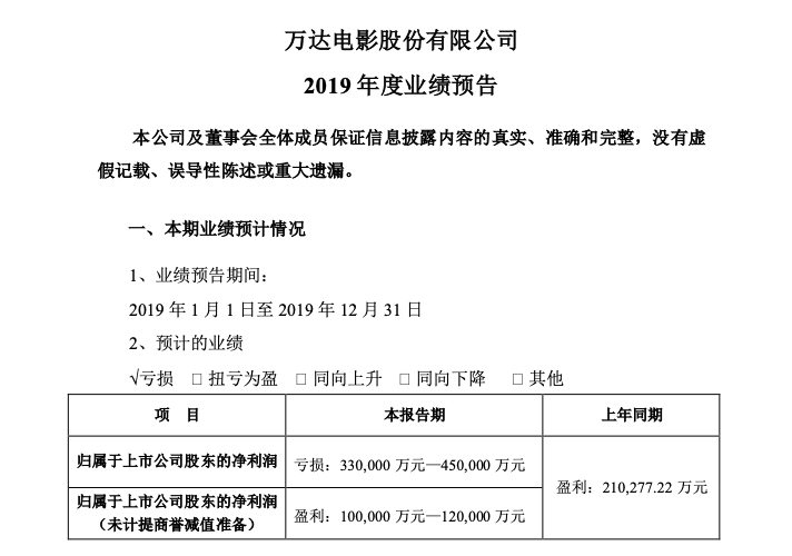 同样的情况还有万达电影,万达电影2019年预计亏损33亿-45亿,而如果不计提商誉减值准备的45亿-55亿,万达电影2019年的净利润是盈利10亿-12亿,虽然不及去年同期,但是扭亏为盈。