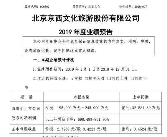 但是这份好运气只保证了北京文化2019年的开头,没能保证它的结局。2019年北京文化预计净利润亏损19.5亿-24.5亿。亏损的原因一方面是由于2019年电影市场的整体下行,爆款电影并不多,北京文化参与投资电影中除了《流浪地球》收获颇丰,其它《攀登者》《被光抓走的人》等电影票房不如预期。电视剧业务、艺人经纪收入也因为行业发展速度暂缓大幅下降。