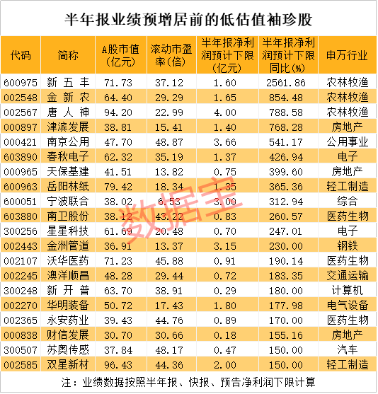 证券时报·数据宝通过梳理发现,A股市值在百亿元以下,收盘价不足20元,滚动市盈率不足50倍,且上半年净利润将实现同比增长的股票,共计111只。从净利润增长情况来看,按照半年报、快报、预告净利润下限计算,34股净利润有望翻倍增长。净利润预计增幅最高的是新五丰,因生猪价格上升,公司预计上半年净利润为1.6亿元至2.4亿元,同比增长25倍以上。猪肉概念股金新农、唐人神净利润预计增幅排在新五丰之后。净利润预计增幅较大的还有津滨发展、南京公用、春秋电子、天保基建、岳阳林纸等。