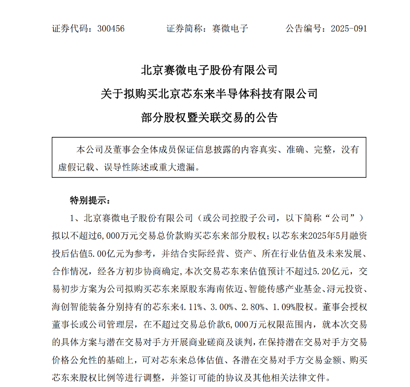 公告称,董事会授权董事长或公司管理层,在不超过交易总价款6000万元权限范围内,就本次交易的具体方案与潜在交易对手方开展商业磋商及谈判。若公司后续与上述潜在交易对手方达成相关协议并完成交割,公司预计将持有芯东来不超过11.00%股权,芯东来将成为公司参股子公司,公司预计为芯东来第四大股东。