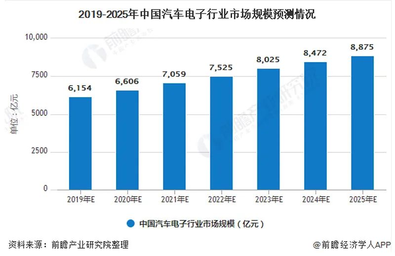 前瞻产业研究院预计,未来中国汽车电子市场规模将保持较快发展,到2025年,中国汽车电子市场规模有望突破8800亿元,向9000亿元逼近。