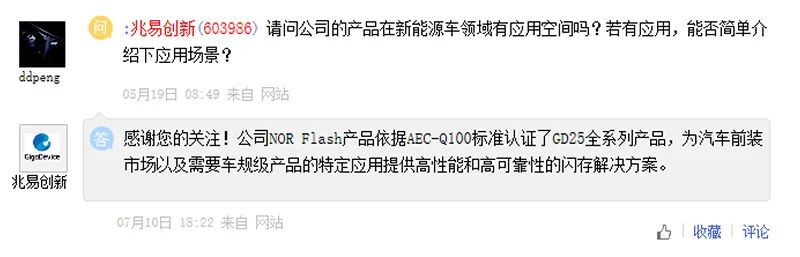 兆易创新在互动易披露,公司NOR Flash产品依据AEC-Q100标准认证了GD25全系列产品,为汽车前装市场以及需要车规级产品的特定应用提供高性能和高可靠性的闪存解决方案。