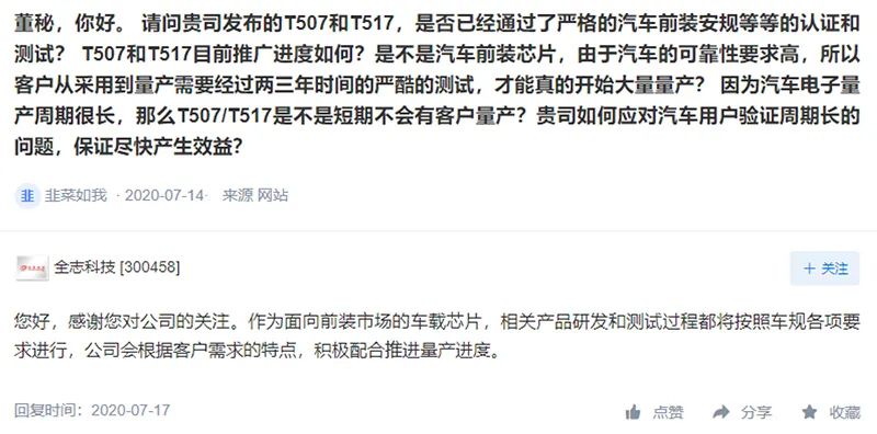全志科技近日在互动易披露,T507和T517作为面向前装市场的车载芯片,相关产品研发和测试过程都将按照车规各项要求进行,公司会根据客户需求的特点,积极配合推进量产进度。