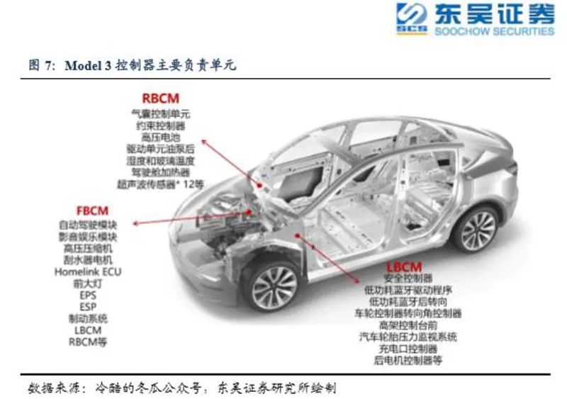 以Model3为例,其E/E(汽车电子电气架构)中央集中式架构包括CCM(一个电脑)、3大区控制器。CCM为整车最高决策模块,包括自动驾驶模块、娱乐控制模块,可接管所有辅助/自动驾驶相关传感器,比如摄像头、毫米波雷达等。