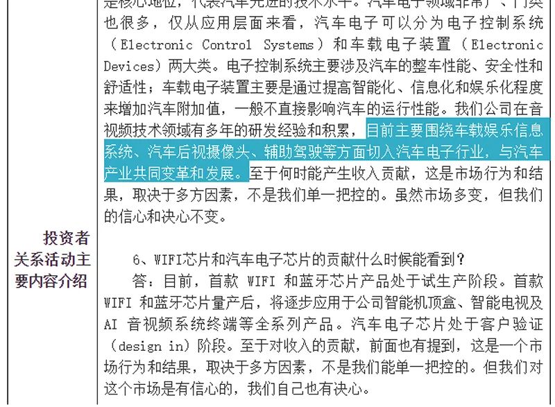晶晨股份在5月份接受机构调研时披露,公司早在IPO前即布局了汽车电子芯片,目前处于客户验证阶段。晶晨股份主要围绕车载娱乐信息系统、汽车后视摄像头、辅助驾驶等方面切入汽车电子行业。