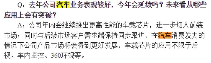 富瀚微在近期接受机构调研时表示,公司年内会继续推出更高性能的车载芯片,进一步切入前装市场;同时与后装市场客户需求端保持同步跟进。公司车载芯片的应用不限于后视、车内监控、360环视等。