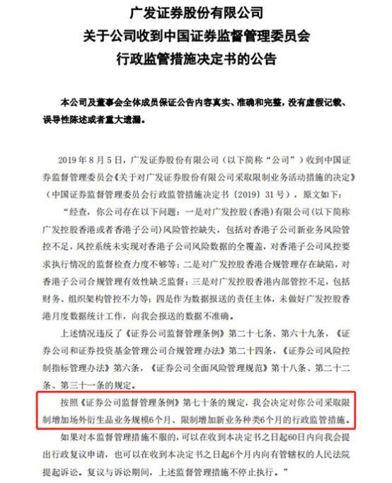 8月5日,广发证券发布公告称,因对旗下香港子公司风控不力、缺乏监督及内控不足,证监会决定对公司采取限制增加场外衍生品业务规模6个月、限制增加新业务种类6个月行政监管措施。