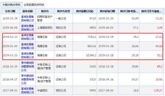 据数据统计,富域发展未解质押股权4.69亿股,占其持有股份数34%以上,其中大部分质押给了海通证券和海通证券资产管理,目前统计显示,至少有三笔质押未解押。