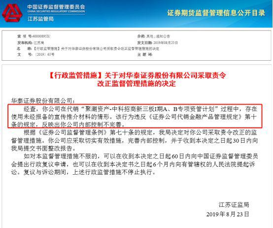 8月26日,江苏证监局发布公告称,经查,华泰证券在代销“聚潮资产-中科招商新三板I期A、B专项资管计划”过程中,存在使用未经报备的宣传推介材料的情形。该行为违反《证券公司代销金融产品管理规定》第十条的规定,反映出公司内部控制不完善。