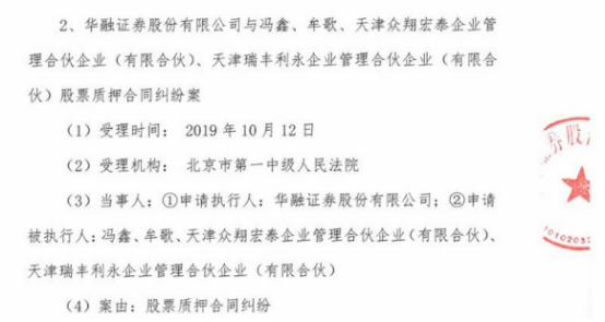 12月5日,华融证券发布涉诉进展公告称,其与冯鑫、牟歌等人的合同纠纷已在10月12日获得北京市一中院的受理,案由为股票质押合同纠纷,诉讼标的为剩余本金3.83亿元及相关利息、违约金、公证费等费用。