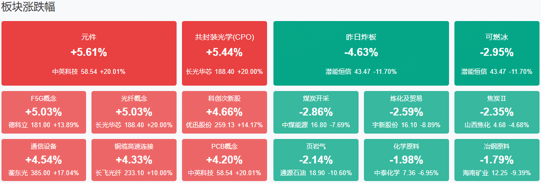 三大指数集体反弹,深成指涨超2%,创业板指涨超3%。沪深两市成交额2.4万亿,较上一个交易日缩量2497亿。盘面上,市场热点快速轮动,全市场超4500只个股上涨。从板块来看,算力硬件概念持续拉升,长光华芯20cm涨停,创历史新高,中英科技、迅捷兴、东山精密、汇绿生态、广合科技、长飞光纤涨停。电力板块表现活跃,绿发电力、华电能源、晶科科技涨停。商业航天概念走强,航天电器、中衡设计涨停。下跌方面,油气股集体下挫,准油股份、洲际油气跌停。煤炭板块走弱,中煤能源大跌。