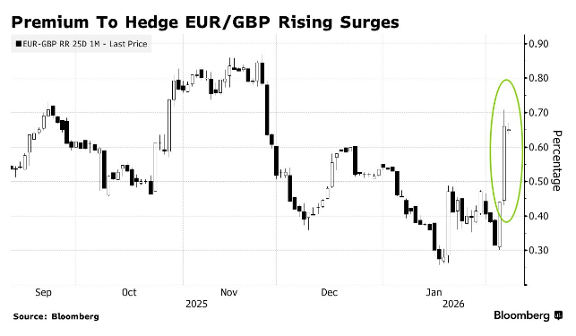 美国存托信托与清算公司的数据显示,2月5日,未来一个月英镑对欧元的下跌对冲溢价较上涨对冲溢价大幅攀升,创下去年11月末以来的最高水平;欧元兑英镑期权交易量也刷新年内峰值,其中押注英镑对欧元走弱的看涨期权交易量,较押注英镑升值的看跌期权高出50%。