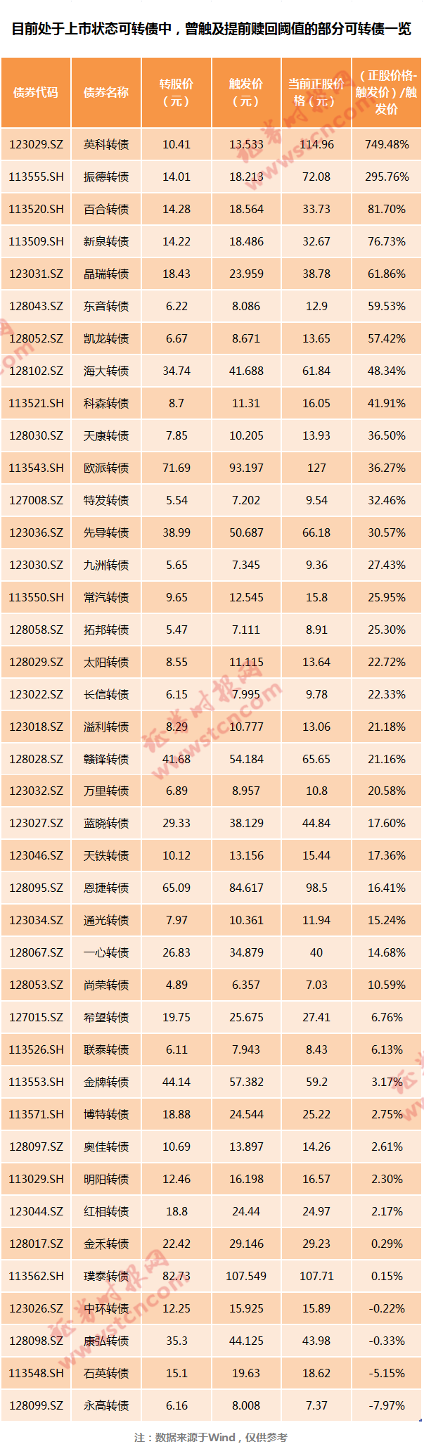 除了万里转债外,实际上已有多只可转债触发提前赎回条款,这些公司的可转债理论上都有提前赎回的风险。