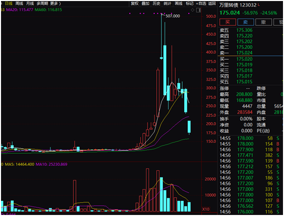 初略计算可以发现,若以公告当日232元的收盘价计算,假设投资者一直持有被公司以100.21/张赎回的话,投资者将会巨亏56.81%。也正因为如此,今日开盘后万里转债即直线下跌,即便以今日收盘价175.024元计算,被强赎仍将巨亏42.74%。