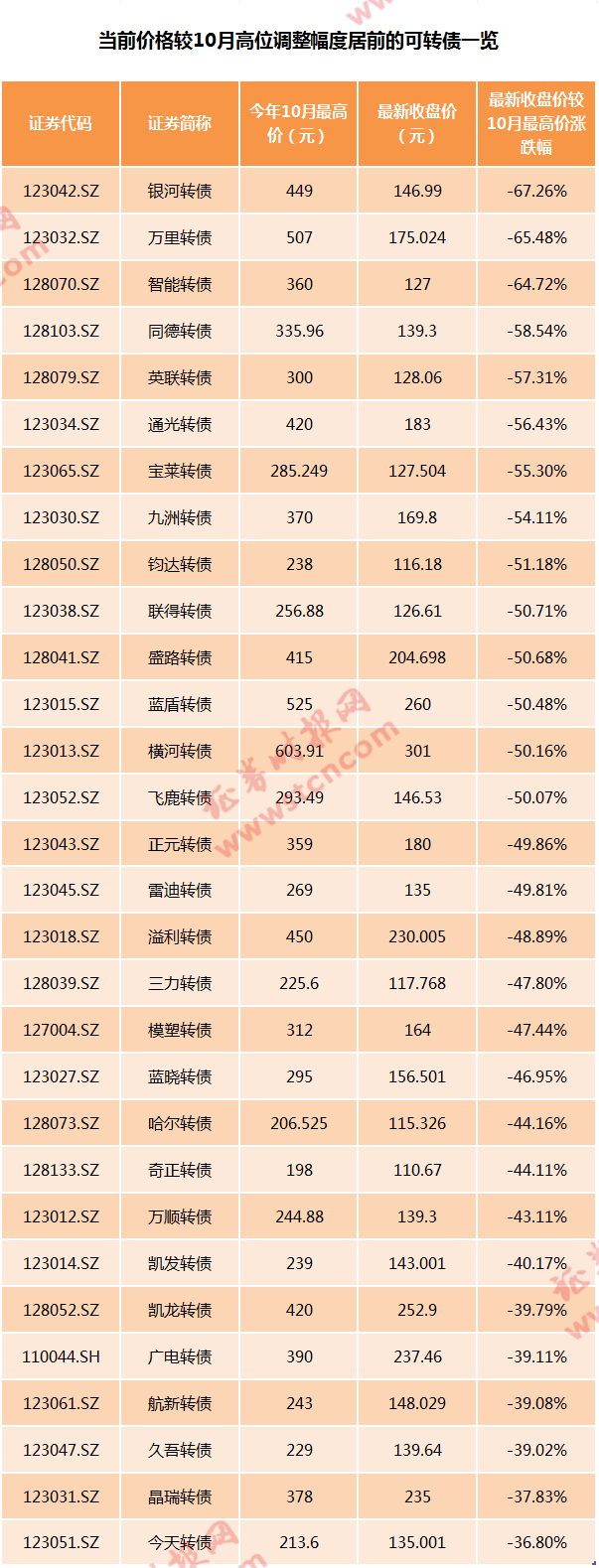 统计数据显示,当前已有多达14只可转债当前价格较10月高位腰斩,其中银河转债、万里转债、智能转债调整幅度甚至超过60%。