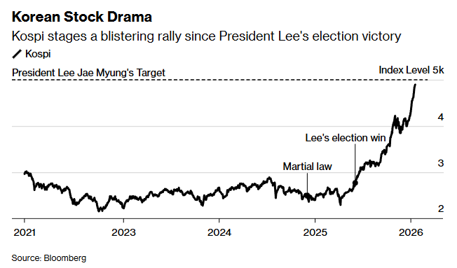 在过去12个月大涨逾94%之后,韩国基准股指Kospi指数距离曾被视为遥不可及的5000点关口仅差约2%。这一目标已被写入韩国总统李在明的竞选承诺之中。郑恩博的乐观表态正是在这一背景下作出的。
