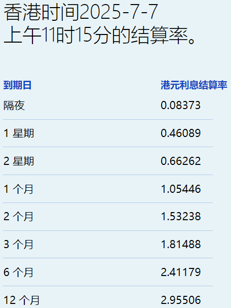 7月7日,港元拆息全线向上,而与楼按相关的一个月拆息连升2日,报1.05446%,升19.571基点,是5月19日后最高;反映银行资金成本的三个月拆息报1.81488%,升3.053基点,是5月20日后最高。