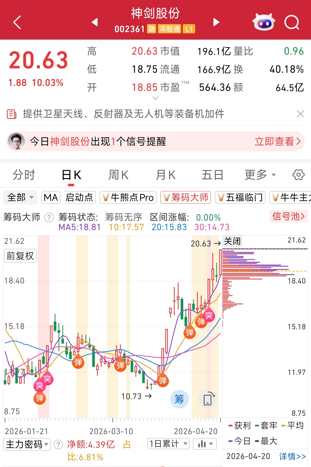 根据筹码大师监控,今日大涨的神剑股份,在4月15日出现突破筹码密集区信号,感兴趣的朋友可以自行跟踪判断。当前有7天体验价活动,只要30元。